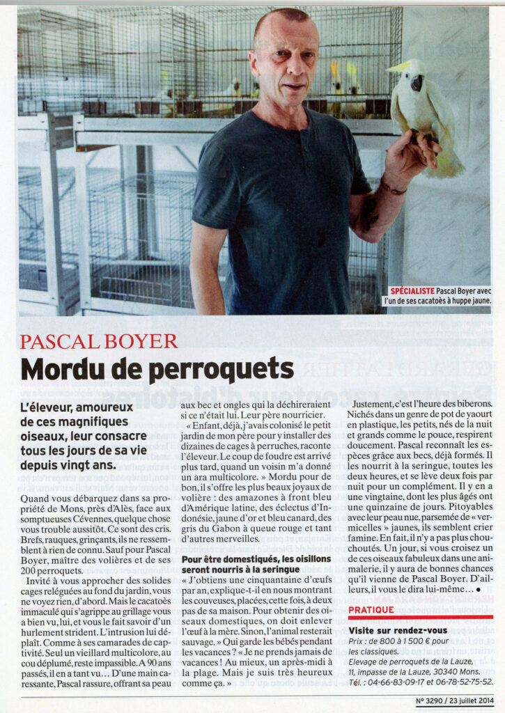 Située à Mons, près d’Alès dans le cadre verdoyant des Cévennes, la propriété de Pascal est un véritable havre pour près de 200 perroquets, des oiseaux magnifiques qu’il élève avec soin et amour.